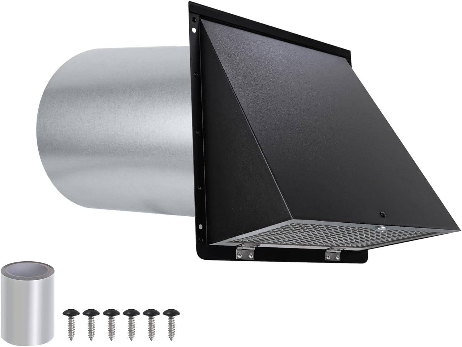 JYINCPED Galvanized Steel Hooded Wall Vent with Screen and Damper, Wall Mount Extractor Vent Used for Ventilation and Air Exhaust ApplicationsSize & Multiple SelectionPipe Length: 8-1/4 InchPipe Diameter: 6 Inch, 8 Inch, 10 Inch, 12 InchVarious Colors: white, black, gray, stainless steelPlease measure vent duct diameter to ensure the size is right before purchasingDesign & FunctionWall mount extractor vent is used for outdoor air exhaust applicationsHinged backdraft damper to prevent air backflow when air outlet closed and easily open to allow air flow when workingMesh screen and damper to prevent snakes, foreign objects, cold air and rain from entering homeAngled hood with wide mouth is designed to balance low profile for optimum air and exhaust flowSound insulation cotton on the baffle to reduce noise and provide quiet operationWider flange ring for a stable installation and enhance security and durabilityRounded corners to prevent scratches and ensure safetyHigh QualityConstructed from high-quality 28 gauge galvanized steelEnsuring durability, rust resistance, anti-corrosion and withstand extreme conditionEasy to InstallDesigned with pre-drilled installation holes on the flange for simple installationComes with installation screws for easy outside wall mounting and secured in placeComes with a aluminum foil tape used to fix and seal the vent duct pipe connection for max ventilation efficiencyWide ApplicationFit for most home wall exhaust vent improvement projectsIdeal for kitchen range hood wall vent, external extractor wall vent, kitchen stove hood wall vent, dryer vent, bathroom exhaust fan vent, basement shop wall exhaust, garage exhaust, laundry exhaust vent,shed wall vent, air conditioner AC wall vent, office exhaust ventilation application