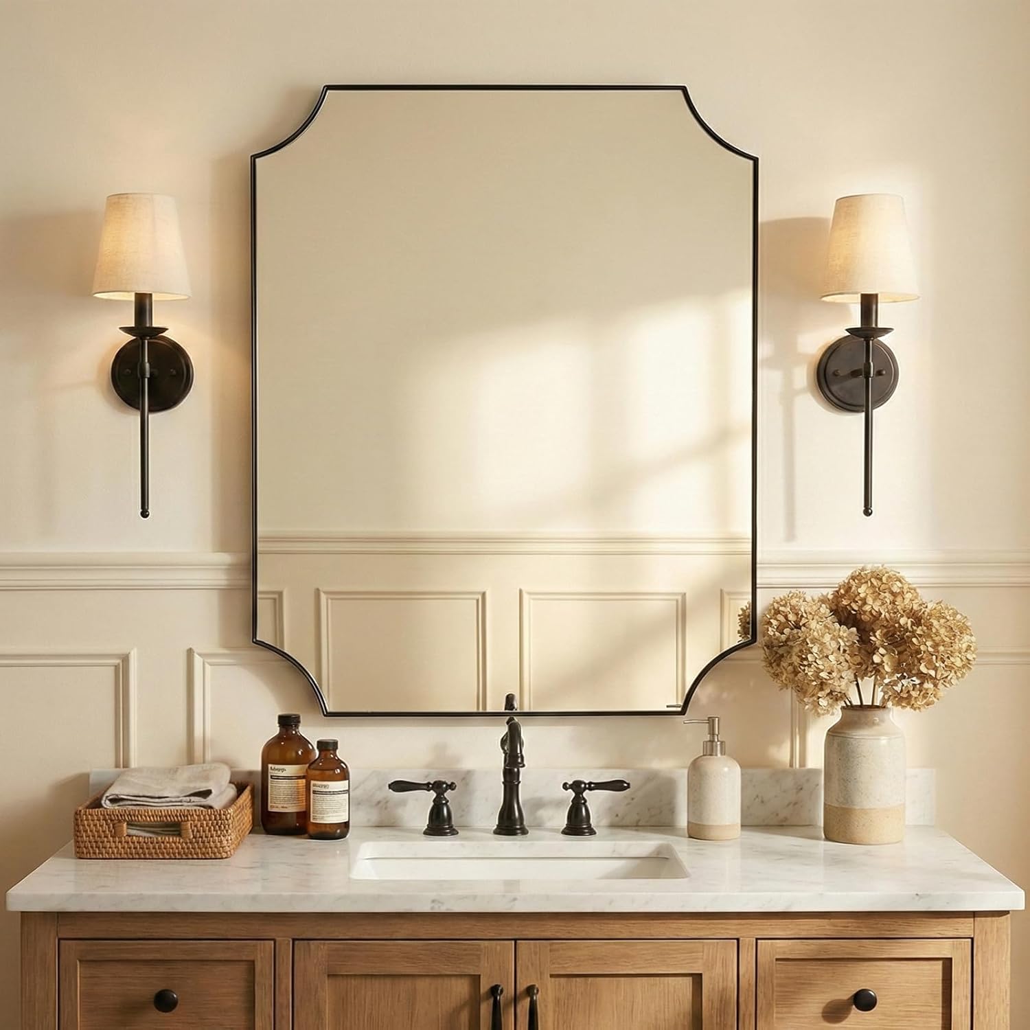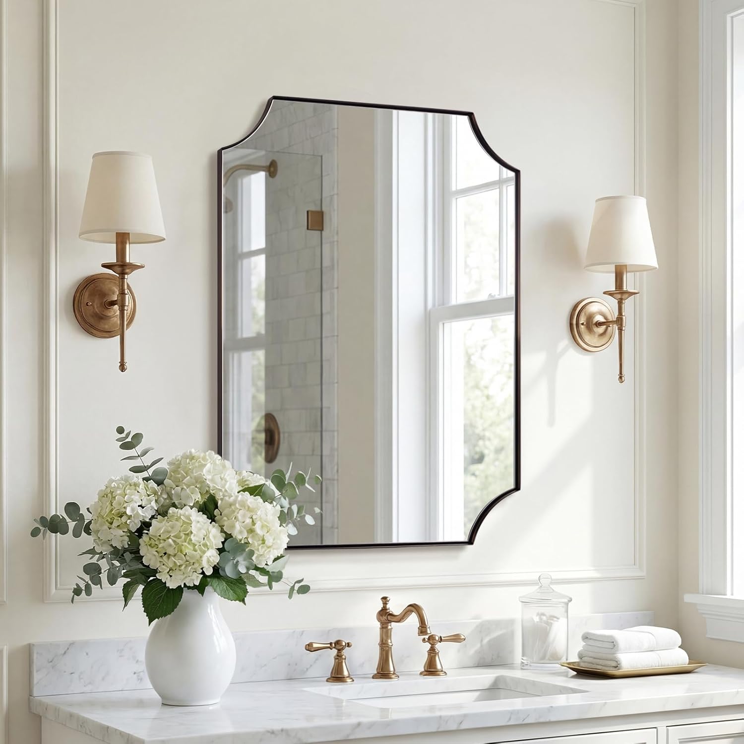 • 【Aesthetic Scalloped Edge Design】: Elevate your bathroom decor with our brushed gold framed bathroom mirror boasting a stylishly sculpted frame. Crafted with intricately curved scalloped edges, each corner showcases a captivating concave scalloped arc, ensuring an eye-catching addition to any space