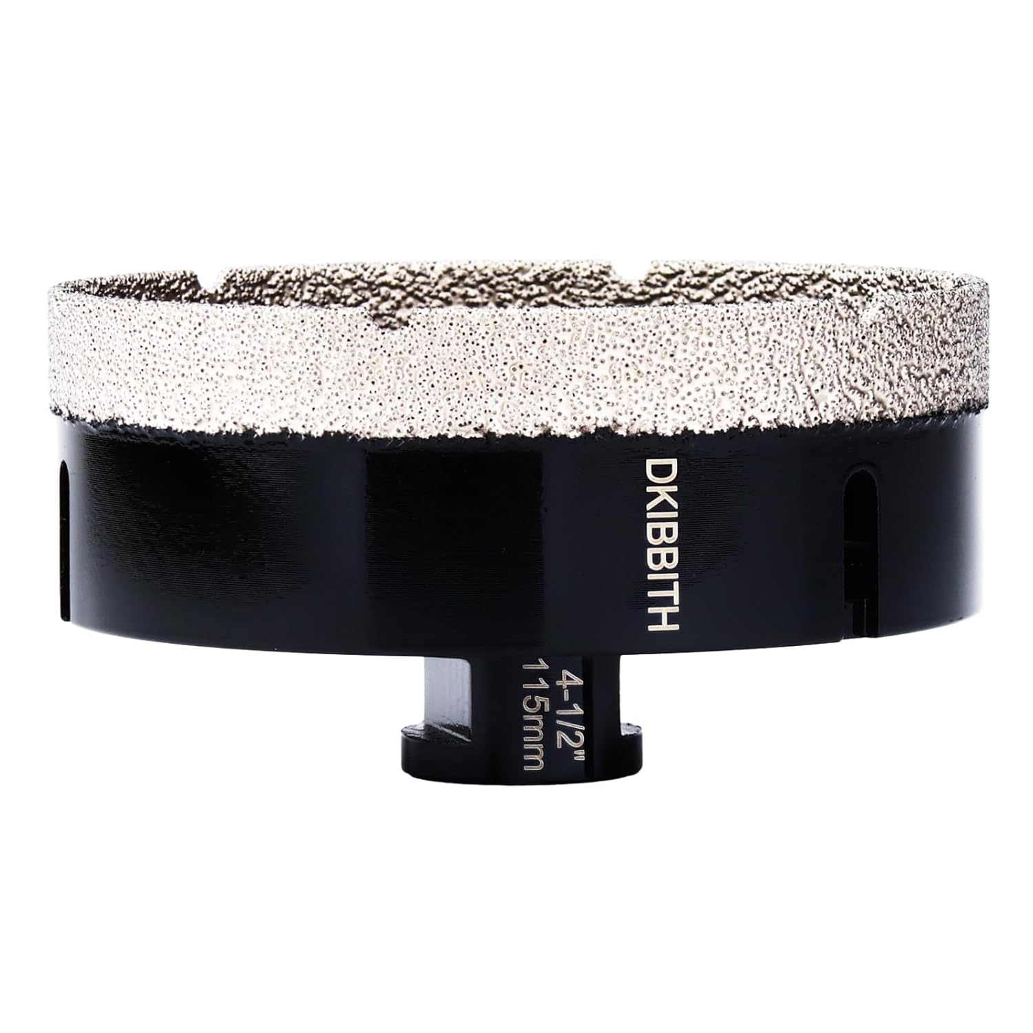 4-1/4" Dry Diamond Hole Saw for tiles are Compatible with various of materials, such as Porcelain, Ceramic, Marble, Granite, Glass Tiles, Natural stoneIt will work with most popular angle grinders and web polishersSpecifications:Diameter: 4-1/4" (110mm)Connection: 5/8-11 female threadDiamond height: 0.59” (15mm)Total height: 2.4” (61mm)Instructions for use:For accurately positioned hole, use a guide if it is possible; If no guide available, place the high-speed rotating drill at a 45-degree angle to get a position groove, then bring the drill up into the upright position slowly and continue.DON’T press the drill, just let the machine do the job. Just a bit of pressure is required for horizontal drilling.The diamond cutter will get hot after drilling holes, please do not touch it. Cooling the bit enough between holes will help to keep it sharp longer.When you feel a core drill slows down in the cut, please try to cut several holes into an abrasive material such as breeze block. It will remove the debris and expose the diamond then make it sharp again.Package includes:1 piece of 4-1/4" Diamond Hole Drill BitApplications for example:1. Installing plumbing fixtures: You can use the hole saw to create holes in tiles or ceramic surfaces for installing faucets, showerheads, or drains.2. Ventilation and exhaust systems: The diamond tile hole saw can be used to create holes for mounting ventilation and exhaust ducts.3. Electrical installations: It is suitable for making openings in tiles and ceramics to accommodate electrical outlets and switches.4. Cable management: to create holes for routing cables or wires through tiles or walls, helping to keep them organized and concealed.