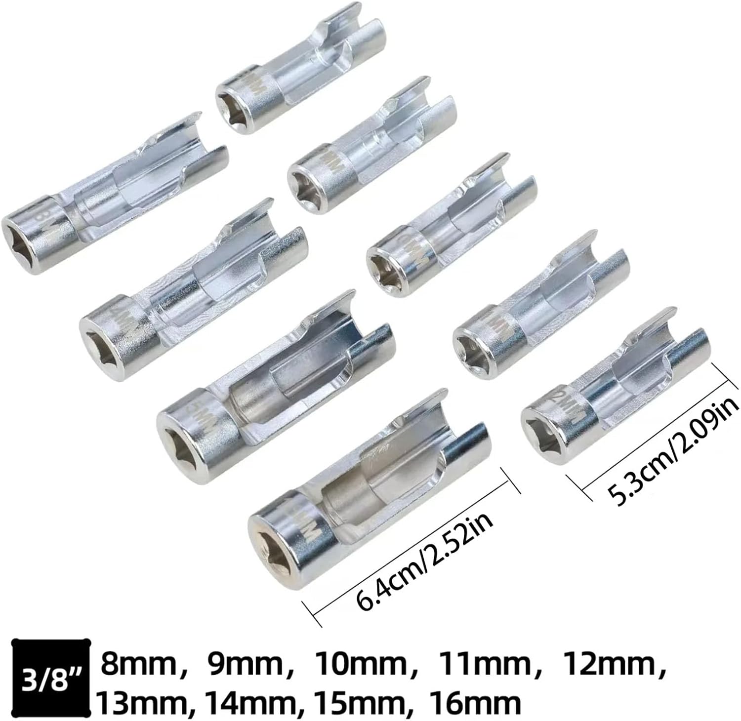 Precise Engineered Metal Socket Wrench Tool 8mm to 22mm for Reliabled in Fuels Engine Repair and MaintenanceFeatures:This versatile open end wrench set exceling at removing fuels lines and oxygen sensors, providing high efficiency disassembly with up to 150Nm torques for reliabled automotive repairs.Featuring hexagonal sizes from 8mm to 22mm, it's crafted from high strength alloy steel with anti corrosions coating and an ergonomic nonslip grip.Designed for professional mechanics and diyer car enthusiasts, this essential auto simplifies tasks for anyone maintaining or repairing vehicles.Ideal for automotive workshops or home garages, it handles scenarios like fuels engine servicing, fuels systems maintenance, and oxygen sensors removal with ease.Boasting a lightweight yet robust build and long lasting durability of over 5 years, this hexagonal wrench ensures safe, fatigue less operations during extended repair .Specifications:Type: Open oil pipe removal socket wrench tool3/8" driveline socket: 8mm, 9mm, 10mm, 11mm, 12mm, 13mm, 14mm, 15mm, 16mm1/2" driveline socket: 17mm, 18mm, 19mm, 21mm, 22mmComponent: metalColor: As shown in the picturePackage Includes:1 Set Hexagonal Socket ToolNote:1.Please allow 1-2cm errors due to manual measurement, make sure that you donot mind befores you order. 2.Due to the differences between different monitors, the picture may not reflect the actual color.Thanks for your understandings.