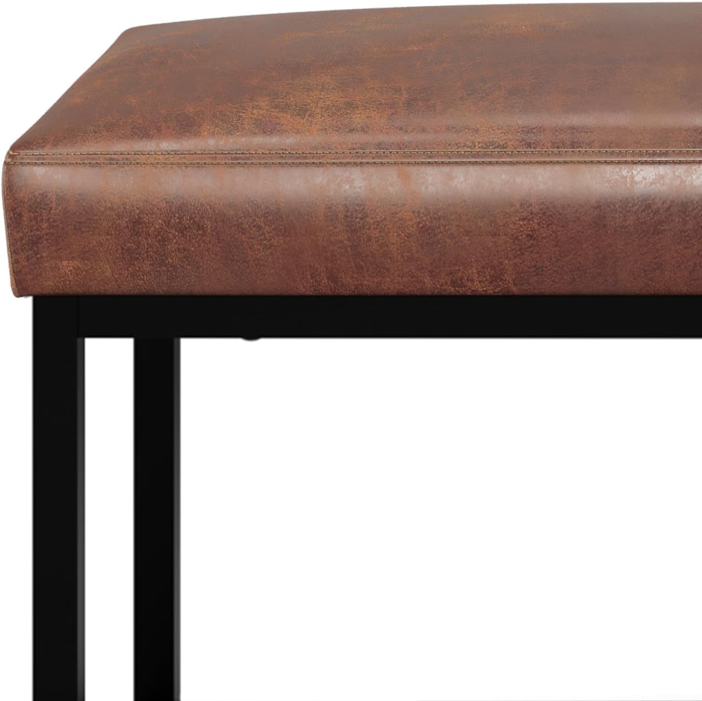 The Reynolds Ottoman Bench is a versatile piece of furniture that can transition from a bench at the end of your bed to an entryway seat, extra seating or a footrest with effortless style. A durable distressed vegan faux leather surface with a metal structure base makes this piece a chic addition to your living space.